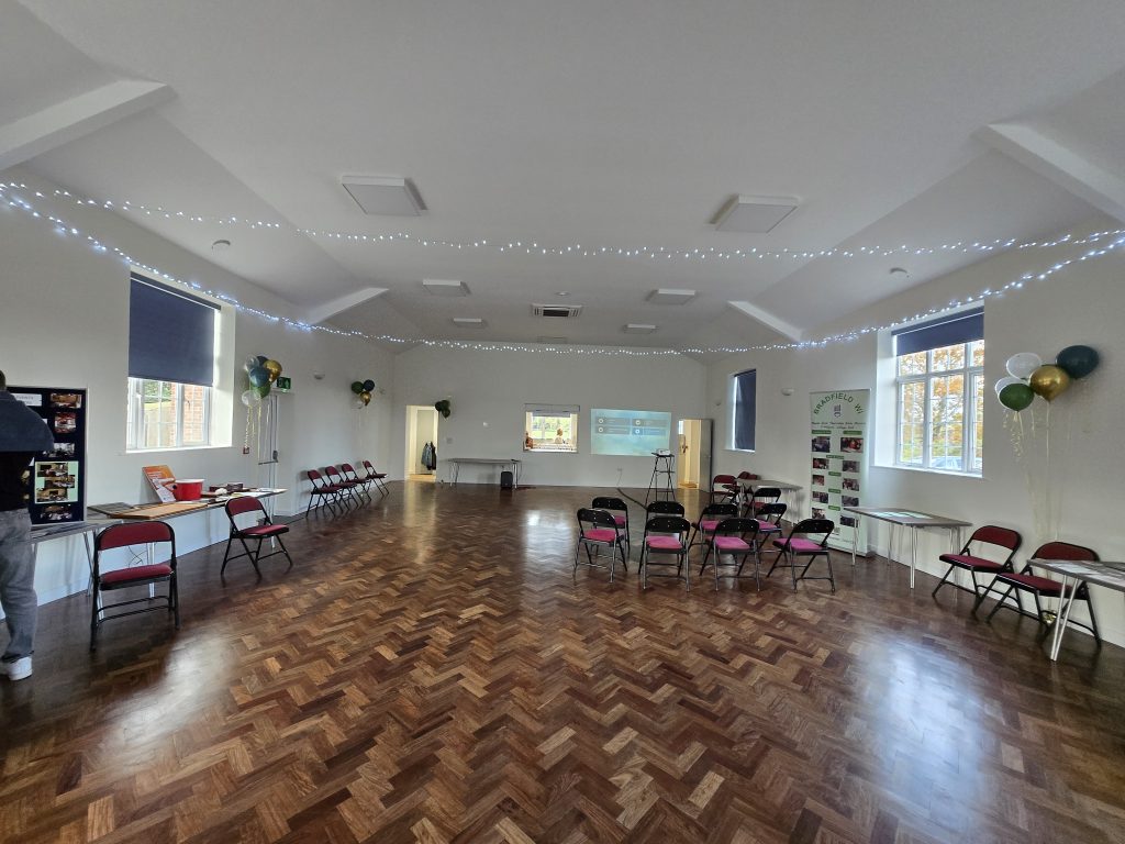 Bradfield Village Hall is situated within 4 acres of land, including a large field behind the hall, a hard court and a popular children’s play park. There is also parking available for about 40 cars, plus overflow parking on the field for large events.  The hall was completely renovated in 2025 – see details.